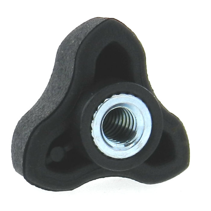 JBF National’s 3 arm hand knob (also known as a clamping knob) is manufactured from an ultra Soft Touch Thermoplastic Elastomer material over top a high quality polypropylene reinforced base knob, to ensure ultimate durability and operator grip comfort. This hand knob features a brass tapped insert with zinc plating for added durability and corrosion resistance. Please see component diagram below.